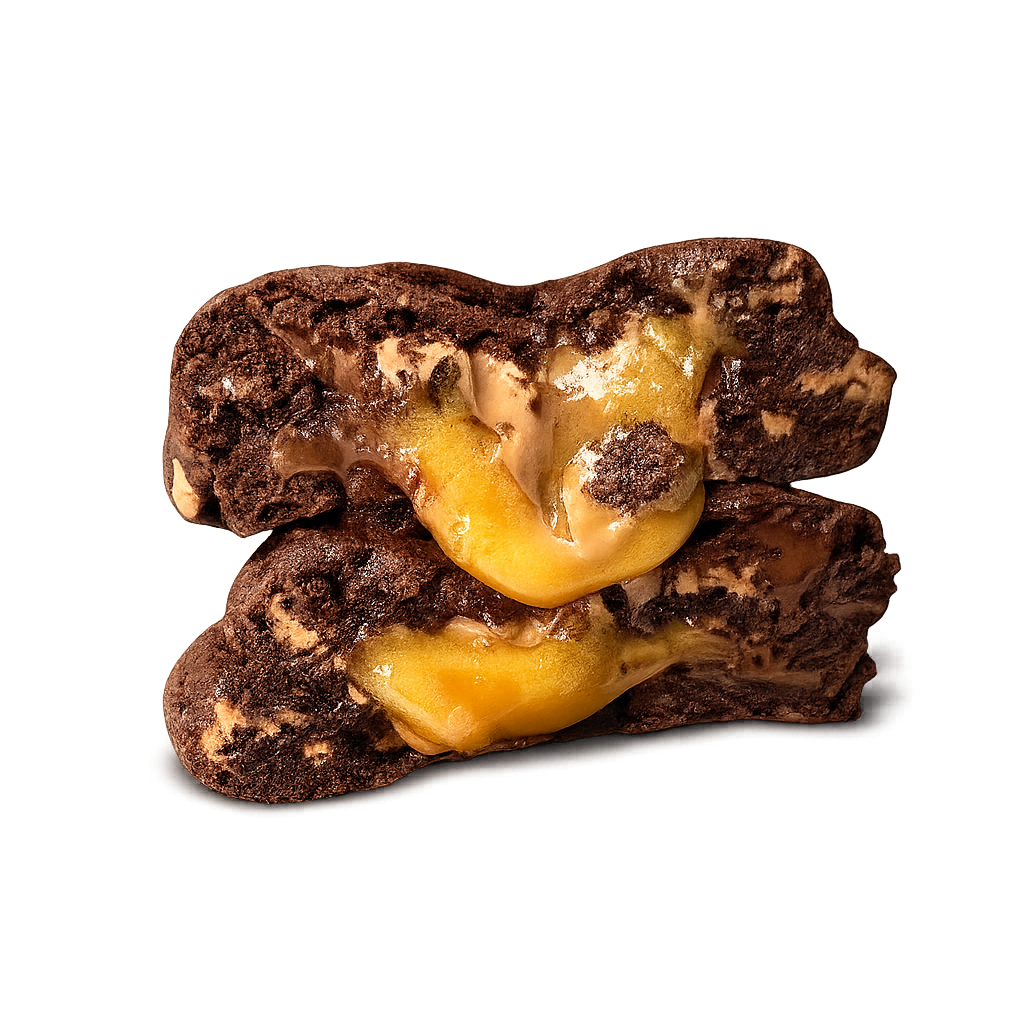 Massa intensa de chocolate amargo, com cacau puro, chocolate amargo e ao leite, e um recheio cremoso de ganache de chocolate branco caramelizado com um toque de sal. Crocante por fora, macio por dentro e com um interior que se desfaz na boca.